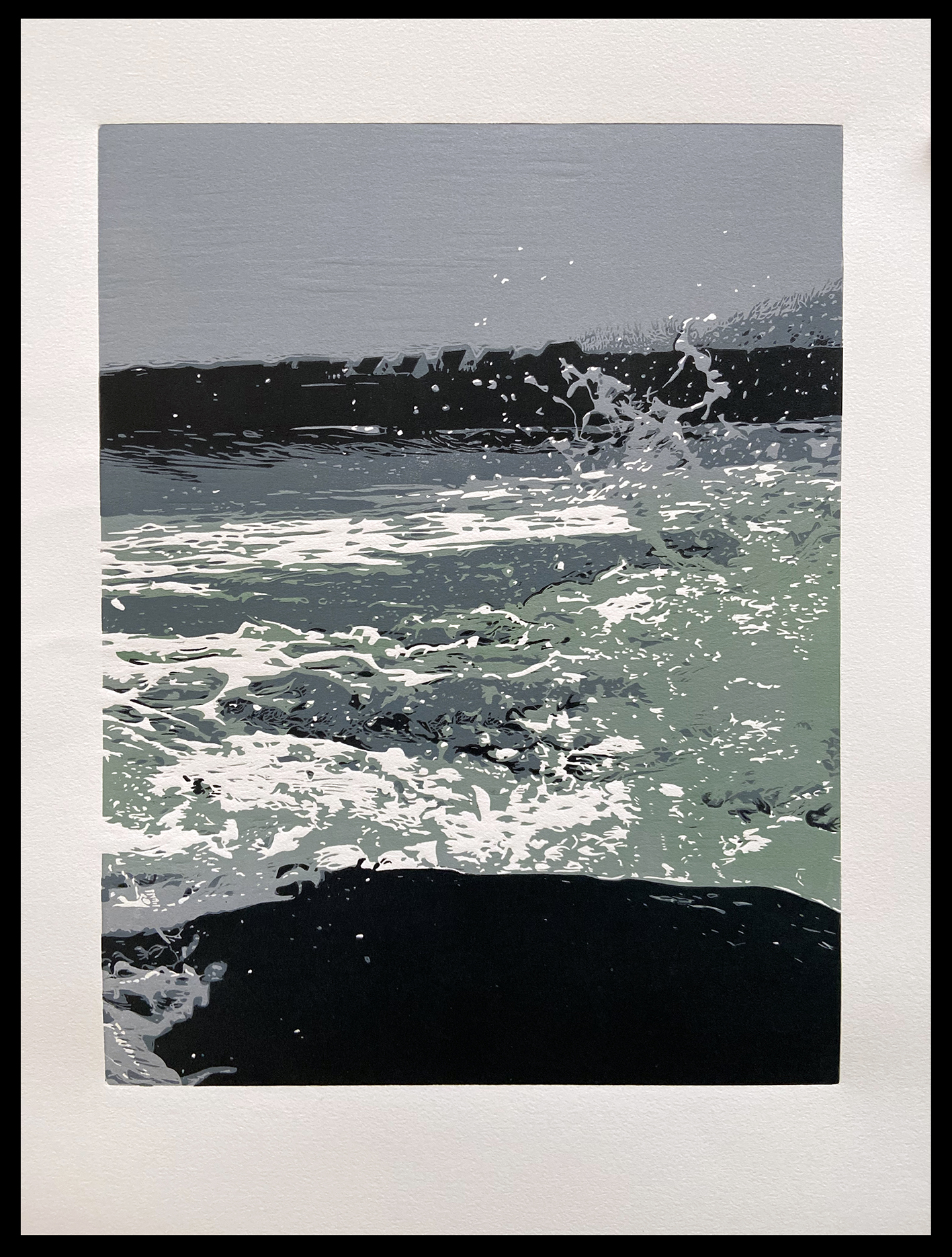 A la lueur du Ressac … « Chaque vague sait qu'elle est la mer. Ce qui la défait ne la dérange pas car ce qui la brise la recrée » Lao-TseuXylogravure - 50x65 cmPapier Arches 250 - Encre Charbonnel Aquawash